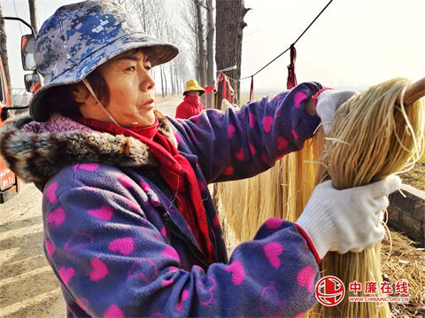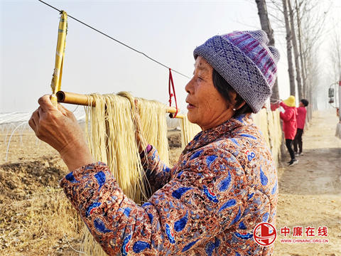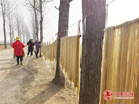 据现场晾晒粉条的农民介绍:粉条加工要完成打粉和面、上瓢、漏条、下锅、冷冻、晾晒这一系列加工程序,少了一道工序都不行,这样制出来的粉条才好吃有筋骨。年前制作和晾晒的可都是当地的红薯粉条,纯手工制作无任何添加剂的绿色食品,不仅爽口耐煮、味醇飘雪、而且营养丰富,是馈赠亲友的上佳年货。(高军 山东省郯城县马头镇党委)