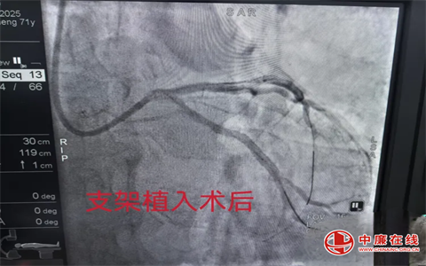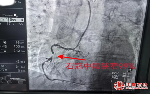 冠状动脉造影作为诊断冠心病的“金标准”,心内科于今日为患者施行冠状动脉造影术。术中与预判的一样,患者右冠中段99%弥漫性狭窄,左回旋支中段90%局限性狭窄。鉴于患者病变严重度和身体耐受性,北京专家和传波带领我院心血管介入医师,优先疏通患者仅存“一线生机”的右冠状动脉,成功放置一枚支架,患者症状缓解。择期治疗左回旋支。