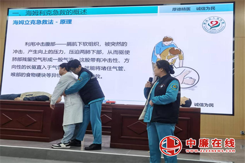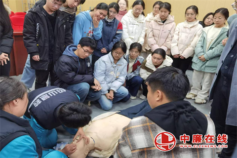 理论授课结束后,实操演练环节有序展开。中医院院区的医护团队化身“实操教练”,逐一示范胸外按压的手势、力度与节奏,开放气道的正确手法,以及人工呼吸的操作要领,每个动作都规范标准、讲解细致,确保师生们直观清晰地掌握操作细节。在医护人员的手把手指导下,同学们踊跃上前实操体验,认真模仿心肺复苏按压动作,反复感受发力部位与节奏把控;对于按压位置偏移、力度不足、频率过快等不规范问题,医护人员及时纠正,耐心解答大家的疑问。现场氛围热烈而有序,200余名师生通过“一看、二学、三练”的沉浸式学习,成功实现从理论认知到实操能力的转化,切实掌握了基础急救技能。