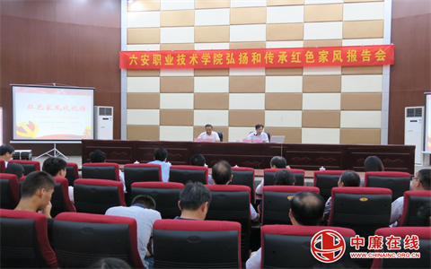 胡遵远(报告席右)在六安职业技术学院做红色家风主题报告。