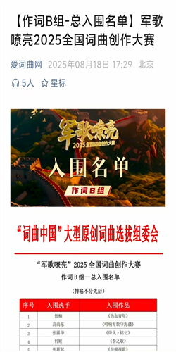 此次“军歌嘹亮2025全国词曲创作大赛”由词曲中国组委会联合众多文化单位、电视台以及著名词曲家共同举办,旨在选拔优秀的军旅词曲作品,弘扬伟大的抗战精神和军人精神,激励新时代的人们铭记历史、奋勇前行。大赛自启动以来,吸引了全国各地的词曲创作者踊跃参与,竞争异常激烈,《临山颂》能够脱颖而出,不仅是对姚三石才华与努力的高度认可,更是山东枣庄红色文化蓬勃发展的有力见证。