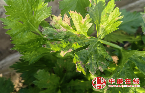 黑山生态农场的蔬菜大棚里叶菜长势繁茂,牛占忠与技术人员(以下简称“技术团队”)一同深入棚内开展农技指导。在查看芹菜、甘蓝生长情况时,技术团队发现部分芹菜出现叶斑病典型症状,随即结合叶片状态、根系发育,现场诊断出田间湿度偏高、种植密度过大等诱发病害的问题。针对设施蔬菜种植,技术团队不仅讲解了密度把控、温湿度调节的标准化要点,还结合当地气候,分享霜霉病、蚜虫及芹菜叶斑病的绿色防控方法,建议采用枯草芽孢杆菌等生物农药、黄板诱杀及轮作换茬等生态手段,减少化学农药使用,守护蔬菜品质安全。