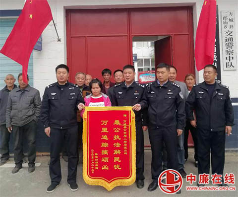 中廉在线11月2日讯:近日,河南省方城县二郎庙镇陈堰村村民胡某某和家人来到镇派出所,把印制有“秉公执法解民忧万里追踪擒顽凶”字样的锦旗送到民警手中,连声感谢他们追回了自己被诈骗的3万余元。