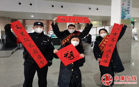 为进一步加强警民联系,提升人民群众的安全感、幸福感、获得感和满意度,在春运首日联合车站开展活动,将工作人员写下一张张饱含美好祝愿的“福”字,赠予来往旅客,同时,根据春运期间旅客需求,为有需要的乘客提供购票指引、行李搬抬等服务。