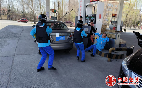 演练现场,由民警扮演的两名暴恐分子在双城区102 国道中石油加油站持凶器对正在加油人员实施威胁。加油站工作人员立即报警,分局指挥中心接到报警后发出指令:立即启动反恐预案进行处置。接到指令的应急处突联合力量迅速驾车驶向案发地。抵达现场后,按照预案及分工,快速疏散群众、加强外围警戒、维持现场周围交通秩序。反恐队员首先与暴恐分子进行周旋,在谈判无效的情况下,突击组队员吸引两名暴恐分子注意力,在其反抗过程中将其击伤,并迅速与工作人员一起将2名暴恐分子控制,解救出被劫持的人质。