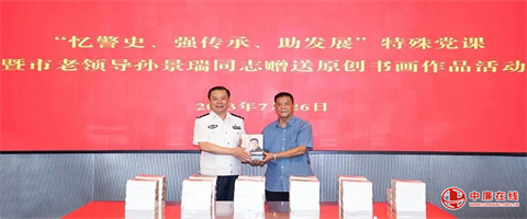 孙景瑞现场赠送了《往日时光——我的四从生涯》等原创书画作品,深情回顾了在枣庄公安的从警岁月,对新一届市公安局党委工作给予高度评价,并从持续正风肃纪、打造过硬队伍,抓实基层基础工作、强化打击防范措施,拓展公安宣传覆盖面、扩大枣庄公安影响力等方面,对进一步做好新时代枣庄公安工作提出了意见建议。