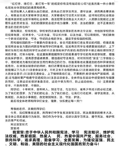 大集会期间,政教处主任周丛彬带领全体学生举行宪法宣誓仪式,用庄严的宣誓声表达对宪法的忠诚和对法治的尊重。