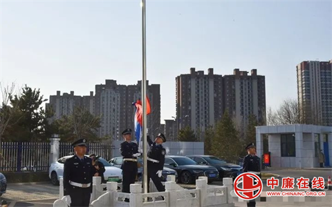 上午10时,随着指挥员的一声令下,三名护旗手迈着铿锵有力的步伐,护送着鲜艳的警旗步入升旗台。在雄壮激昂的警歌声中,警旗缓缓升起,迎风飘扬,全体民警面向警旗,庄严敬礼,表达对公安事业的无限忠诚和热爱。在刘波同志的带领下,全体民警高举右拳,面向警旗,重温《公安机关人民警察誓词》,进一步激发了全体民警的职业荣誉感和使命感。