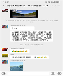 自2024年起,江西省公安厅交管总队高速交警六支队针对辖区福银、抚吉、济广、南韶、莆炎等高速公路货车流量大、人流量密集的特点,筛选了1900多辆高频通行的大型车辆,组建了高速公路高频车辆服务微信群。群内实时发布交通法规、路况信息等内容,民警在线答疑解惑,群内活跃度与参与度持续攀升。随着微信群的作用日益凸显,原有的群组已无法满足需求,江西省公安厅交管总队高速交警六支队又相继成立了七个“平安江西行”高频车辆服务群,共招募287名义务巡逻员,覆盖辖区内六条高速公路。各大队情指中心24小时值守,确保群内消息第一时间得到回应。