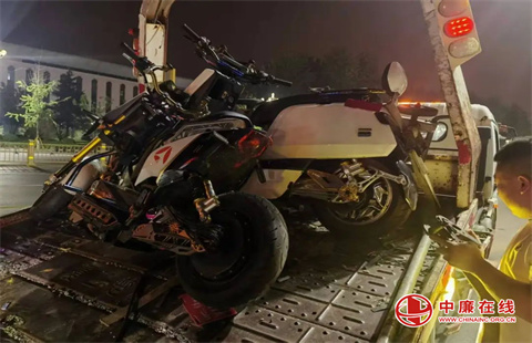 ▲滕州市局对未成年人“飙车炸街”违法行为进行集中治理,图为某执勤点查处2辆改装“电摩”。