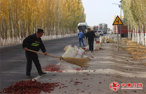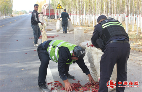了解情况后,民警立即分工行动。一组人员在来车方向设置警示标志,开启警灯与危险报警闪光灯,指挥过往车辆减速避让、交替通行,严防次生事故发生;另一组人员则拿起扫帚、蛇皮袋子,不顾辣椒呛味带来的不适,弯腰蹲地捡拾散落的辣椒。