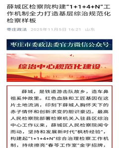 山东省枣庄市薛城,是铁道游击队故乡,造车鼻祖奚仲故里。红色血脉和工匠基因在这片土地流淌,印刻下薛城人胸怀天下的赤子情怀和创新求变的胆识豪迈。最高人民检察院部署检察机关入驻县区综治中心工作以来,薛城区人民检察院闻令而动,坚持和发展新时代“枫桥经验”,构建起“1+1+4+N”综合治理检察工作机制,持续擦亮“春苓工作室”金字招牌,有效融入全区社会治安综合治理,全力打造基层综治规范化检察样板。
