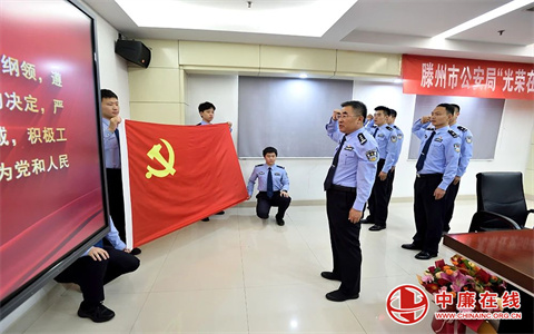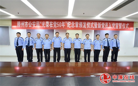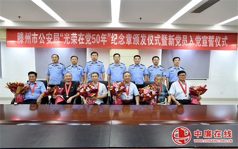 百年征程、初心如磐,忠诚本色、熠熠生辉。为庆祝中国共产党成立 104 周年,7月1 日,山东省滕州市公安局隆重举行“光荣在党50年”纪念章颁发暨新党员入党宣誓仪式,弘扬党的优良传统,增强党员的荣誉感、归属感和使命感,让初心薪火相传,把使命永担在肩。滕州市政府党组成员、市公安局党委书记李涛,市公安局党委副书记、政委徐美湖及全体党委委员出席了活动。全市公安机关党龄50年以上的老党员代表,市局机关党支部相关负责同志及4名新党员代表参加了活动。