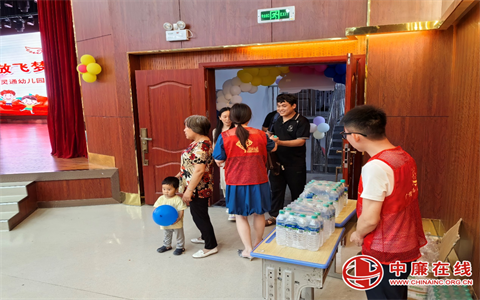 活动开始前,社区志愿者在门口负责迎接前来参与活动的家长,为他们提供水和纸巾,引导他们落座,维持现场秩序。