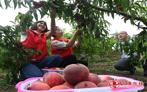 2023年5月13日,在四川省内江市东兴区双才镇芦音村夏满蜜桃种植基地,区纪委监委的党员志愿者正通过网络平台帮果农宣传推销。
