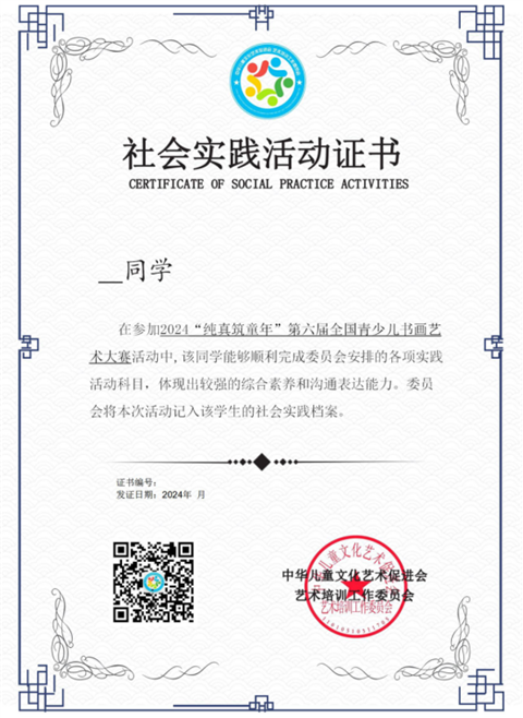 (4)集体组织参赛评审及比比赛获奖证书1本+中华儿童文化艺术促进会艺术培训工作委员会颁发社会实践活动证书1本,费用共计80元+入编《 2024“纯真筑童年”第六届全国青少儿书画艺术大赛作品集》/册共计228元人民币。