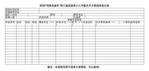 4.凡组织团体报名单位,请详细填写团体参赛登记表,统一邮寄。并请组织者结合每位作者平时成绩初评获奖等级,供评委会参考。