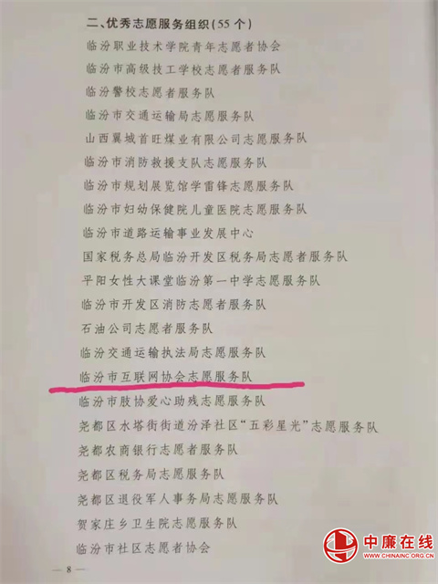 在此次评选中临汾市互联网协会获得“优秀志愿服务组织”的荣誉称号。(临汾市互联网协会)
