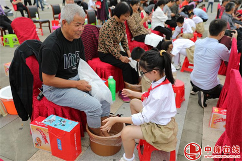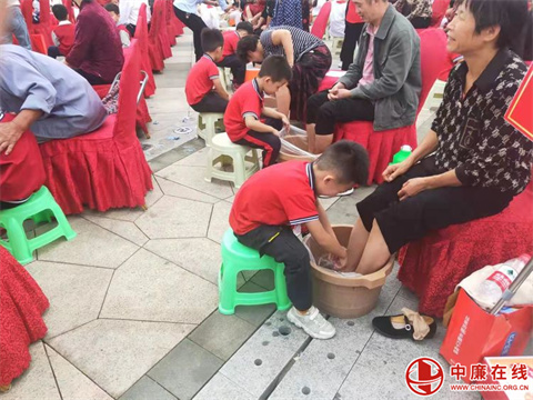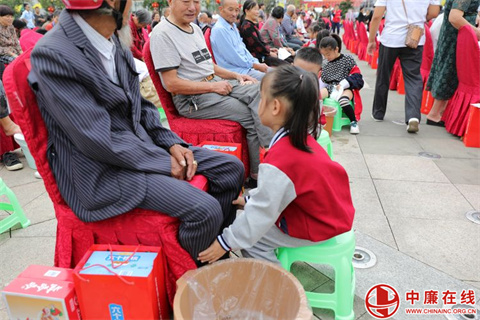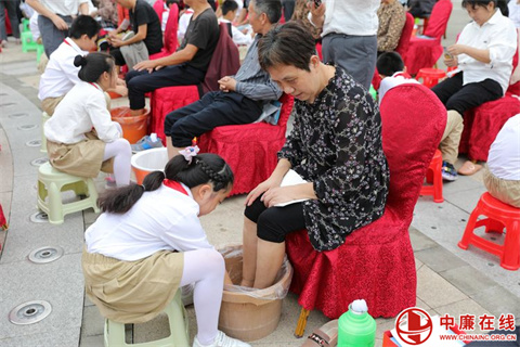 以孝治家队伍俯身为老人们洗脚按摩,一盆盆温暖的水,一双双温暖的手,一句句温情的话语,一双双温柔的眼睛,汇成了此刻最温馨的画面。龙回实验小学和幼儿园的孩子们用最轻柔的动作为眼前的爷爷奶奶洗着脚,模仿前面的叔叔阿姨为爷爷奶奶捏捏肩、锤锤腿,无声的行动是对“孝”最好的传承。在爷爷奶奶的眼中满是欣慰与感动。