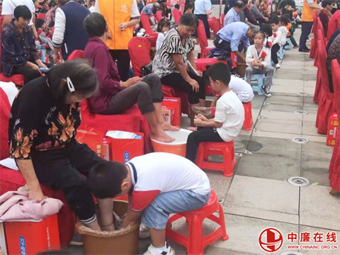 香溪社区党委副书记龙回村党组织书记吴汝中带头给90岁老母亲洗脚,带动了村干部、党员、村民义工们参加洗脚孝敬老人。