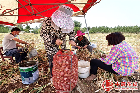 5月24日,山东省郯城县马头镇双兴社区陈墩村农民正在复垦土地上收获大蒜。瞧,丰收的喜悦挂在脸上。农民一边挖蒜、一边整理装袋,田间地头呈现一派繁忙的景象。
