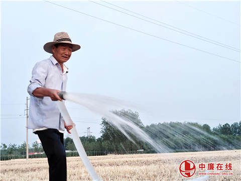 6月14日,天旱高温无雨。黄昏之际,山东省郯城县马头镇益民村村民正在西湖片抽水喷灌收割后的麦地,进行抗旱播种。