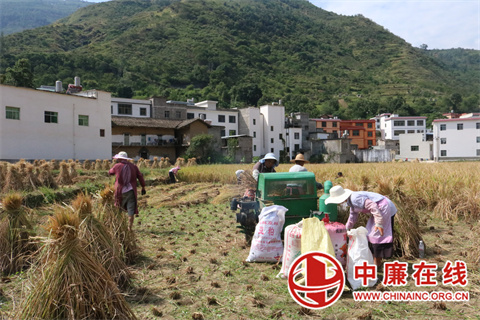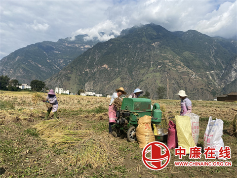 水稻田一片繁忙的景象,三五成群的村民正在田间地头收割成熟的水稻,他们幸福的笑容,在阳光下发出耀眼的光芒。老街社区是一块宝地,地处金沙江畔,属于金沙江干热河谷地带,水热条件好,土质肥沃,所产稻米蛋白质含量较高,香味浓郁。