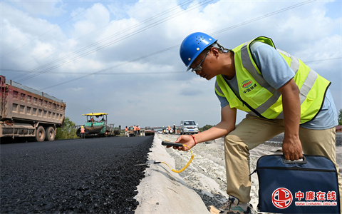 4月13日,四川省内江市东兴区联合水库,内大高速公路(四川境)项目控制性工程联合水库大桥正在进行沥青混凝土路面铺筑。