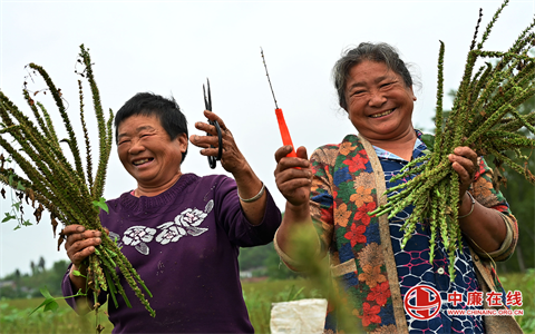 6月3日,四川省内江市东兴区平坦镇水梨村,当地村民在校地联姻“试验田”里采收中药材车前子。