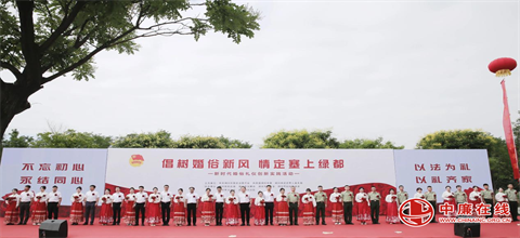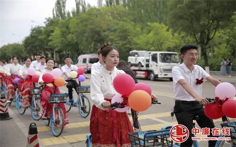 活动中,新人带头倡树婚俗新风,现场行合卺礼等中华优秀传统礼仪,宣读推进移风易俗、抵制高额彩礼倡议书,集体以骑乘共享单车的形式走进市中心街区示范宣介,以新时代青年的奋斗姿态弘扬家庭美德、厚植家国情怀。