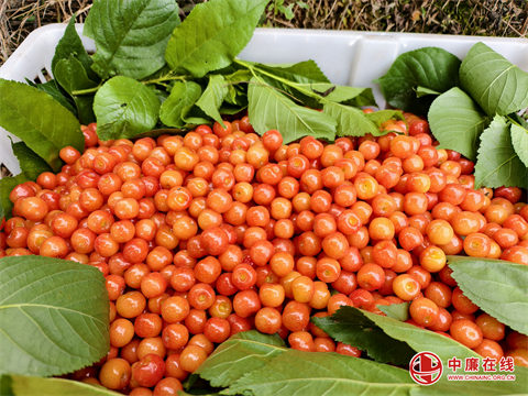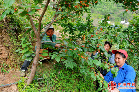 晨曦微露,种植户金荣有的樱桃园已是一派火热景象。三五工人挎着竹篮穿梭林间,手指轻捻间,颗颗樱桃滚落筐中。“别看这‘土樱桃’个头不大,果香浓、酸甜正,老品种的滋味最勾人!”金荣有轻抚着挂果的枝条,黝黑的脸上绽开笑容。三年前种下的樱桃树如今已全部挂果,他身后山腰处,去年新建的蓄水池在阳光下泛着银光,蜿蜒的滴灌管网如血脉般滋养着每一株果树。“多亏政府修了水利,今年樱桃喝饱了水,果粒比往年更饱满!”
