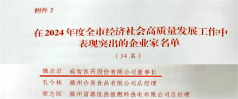 4月18日,在全市2024年度高质量发展综合绩效考核总结会议上,山东省滕州市大坞镇荣获“2024年度高质量发展综合绩效考核一等奖”、“招商引资特别贡献奖”等多项荣誉。威智医药董事长魏彦君荣获“2024年度全市经济社会高质量发展工作中表现突出的企业家”