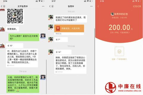 赵春生是太平村的贫困户,妻子张秀华身体残疾常年卧病在床,每月仅靠打零工赚取生活费。2014年张秀华开始在家做起了手工编织,村干部和驻村干部通过网络帮她进行销售,生活条件逐渐改善。防控工作开始以来,赵春生义务加入了太平村的疫情防控工作,张秀华更是将家里的60个口罩和200元钱捐给了防控一线,她说:这是我今年的第一笔收入,一定要捐给防疫一线的工作人员,他们太辛苦了,我有困难大家帮我,国家有难,我不能袖手旁观。”虽然捐献的不多,但这却是他们的所有,是他们发自内心的真实表达。