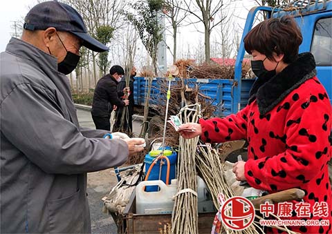 中廉在线2月27日讯:2月26日,在山东省郯城县马头镇玉带社区富民村路旁,带着口罩的农民在争相选购板栗树苗。
