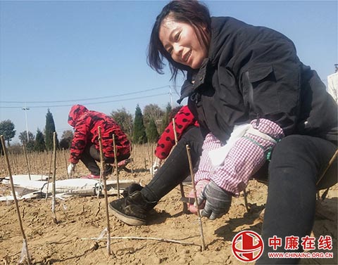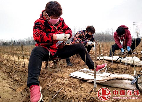 中廉在线3月6日讯:3月5日,山东省郯城县马头镇采莲湖社区抗疫“女汉子”正在采莲湖片苗木基地嫁接“希望”。