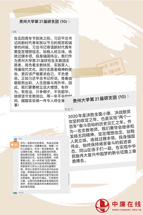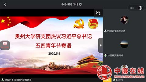 中廉在线5月6日讯:在五四青年节之际,中共中央总书记、国家主席、中央军委主席习近平代表党中央,向全国各族青年致以节日的祝贺和诚挚问候。贵州大学第21届研支团全体成员也开展了一次特别的线上学习,热议了习近平总书记的青春寄语,并结合支教实践与体会纷纷发表了学习体会。
