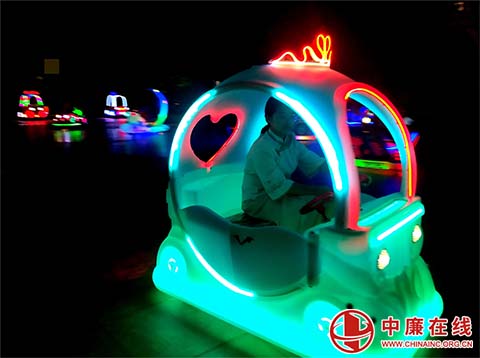 广场游乐车是一种小型的电动设备,体积小,动感强,可以定时遥控,车身还带有漂亮的五彩灯光,十分吸引年轻人和儿童。他们亲自驾驶和乘坐电瓶车,体验到开车的感觉,在风驰电掣间感受到幸福和快乐。(高军摄影)