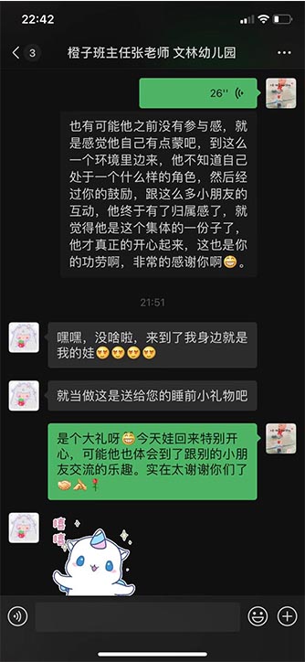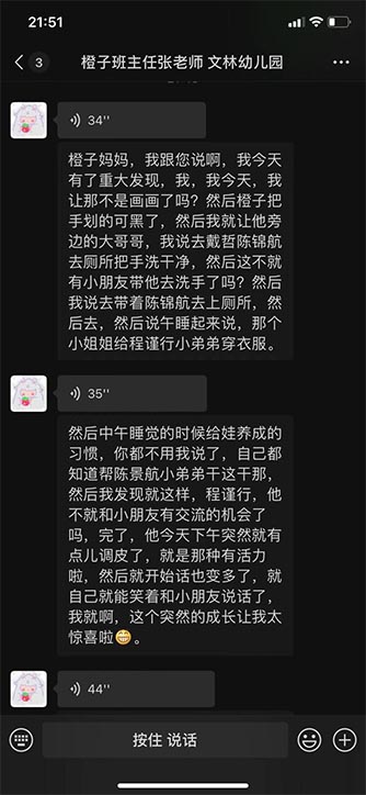不同于普通幼儿园只关注幼儿的身体成长,文林幼儿园重视孩子的心理能力、社交能力、表达能力等各方面综合素质的培养。星星小二班的三位老师更是见微知著,关注孩子的心里成长,用爱去滋养润泽孩子的心灵。虽然橙子爸爸不能常伴孩子左右,像家一样温暖的幼儿园、爱生如子的老师,都让他无比放心。