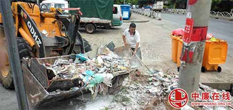在整治现场中,陈世金同志总是第一个到达现场,最后一个离开。他不怕脏、不怕累,面对不能利用机械清理的陈年的垃圾,他总是第一个冲在前面,深入垃圾最多的地方开展整治工作。