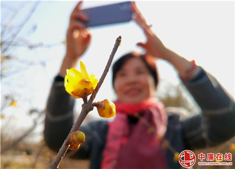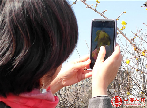 2月2日,一位游玩的女士正在山东省郯城县经济开发区绿化园的腊梅花园内拍摄绽放的腊梅花。明日立春,腊梅争相绽放喜迎春,为春节的到来增添了春的美景。(高军)
