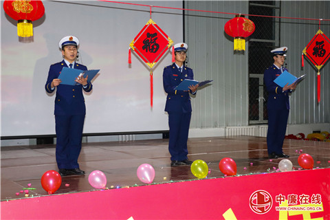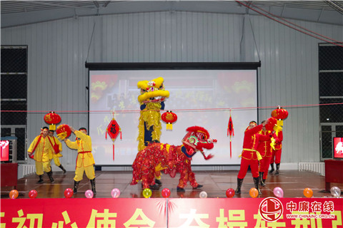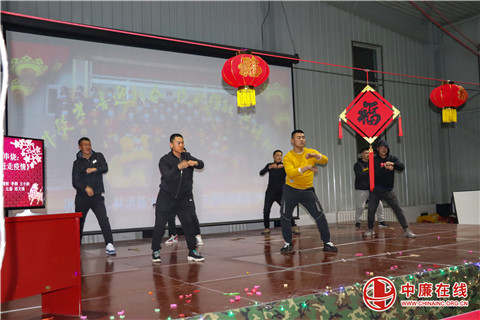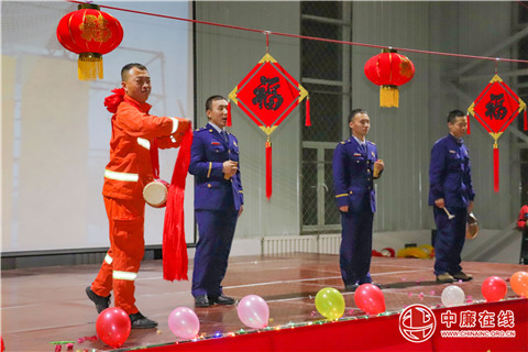 晚上9点整,晚会以《舞狮表演》开场拉开热潮。舞狮的寓意就是可以带来好运,它时而暴跳,时而文静,或蹲或坐,或立或行,摇头甩尾,左顾右盼八方,头尾动作协调,连若一体的表演栩栩如生。教导员刘杰代表大队党委向指战员与家属致词,对全体指战员全年的工作成绩给予肯定,向全体指战员家属致敬,感谢家属们在工作中的默默支持,新年之际,致以指战员及家属们最美好的祝福。