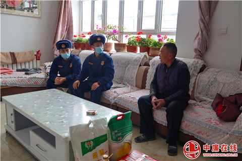 由大队教导员刘杰同志带队,慰问组来到四中队中队长徐兵山的家中,同他的父母进行了交谈,询问了二老的家庭生活和身体情况,表达了组织的关心,送上了节日的祝福,赠送了米、面、油等慰问品。徐兵山同志的父母表示,“感谢队伍对儿子的关心和培养,对我们一家人给予的关怀和帮助,作为家属,我们还是会一如既往地支持森林消防事业,祝愿大队的发展建设越来越好。”
