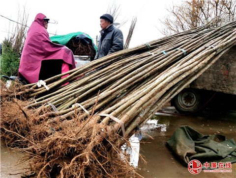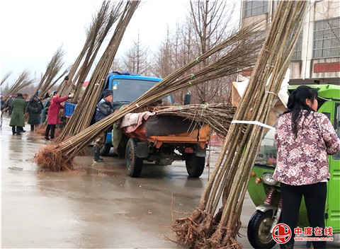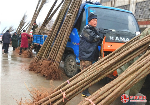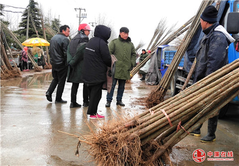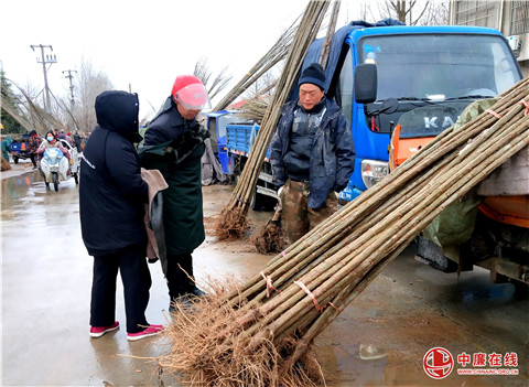 春雨好时节,农民购树忙。山东省郯城县马头镇许多农民抓住这一有利机会,纷纷冒雨到集市上购买苗木树苗,为房前屋后、道路两旁植树补绿,美化好自己的绿色家园。(高军)