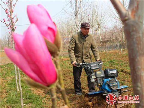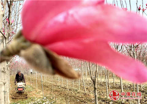 3月12日,采莲湖湖片农民正在花卉苗木基地耕田