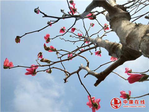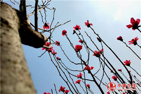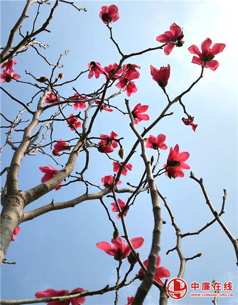 阳春三月,花开烂漫。山东省郯城县马头镇采莲湖社区南湖苗木基地的娇红一号开出了夺目的花朵,远处望去鲜红一片,绚丽的花朵挂满枝头,引人注目。近前树下仰望,娇红造型各异,透过蓝色的天空娇红花魅力四射,展出新姿。(高军 山东省郯城县马头镇党委)