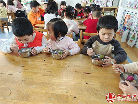 在一阵欢快的律动后,热气腾腾的汤圆出锅了啦!孩子们围坐在一起品尝汤圆,圆滚滚的汤圆,包裹着美好的祝愿,包裹着甜美的生活,包裹着孩子们喜悦的心情。孩子们纷纷感叹今天的汤圆好像比以往的更加美味!