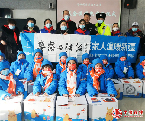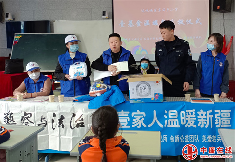1月7日,新疆青年志愿者协会,乌鲁木齐市团委青年志愿者协会金盾公益,联合公安部《警察与法治》新疆站,达坂城区教育局,达坂城区公安分局东沟派出所及关爱老兵团队,在东沟乡小学举行壹基金蓝色温暖包发放仪式。