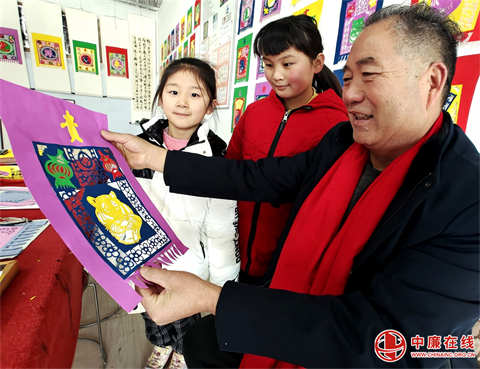 1月26日,吉祥虎年临近,在山东省郯城县马头镇万高冊村挂门笺创作室张乃苍正与孙辈们一起,正高兴地欣赏自己刚刚制作出来五彩挂门笺——“虎迎富贵年”、“金虎迎新春”。“虎”字挂门笺喜迎虎年,虎虎生威,栩栩如生。