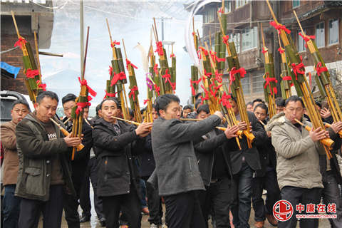 仪式上,数十支芦笙齐鸣,瞬间乐声悠扬,笙歌宏亮,在声声喧闹的爆竹声中,平彦村党总支部副书记潘治新为离任村支书潘昌和颁发“光荣退休”奖牌。萧萧芦笙,表达着对离任村支书潘昌和同志崇高的敬意和衷心的感谢,同时激发着平彦村新任村干部干事创业的热情。
