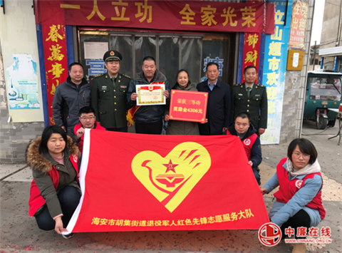 一人立功,全家光荣。1月21日上午,江苏海安市委常委、人武部部长夏鹏飞,海安市退役军人事务局局长韦宝军,副局长李存根一行,在胡集街道党工委委员、人武部部长王贤峰的陪同下,专程到海安市胡集街道北景庄村敲锣打鼓将现役军人景小波在2020年度荣立的“三等功”喜报和奖励金等送到其家属手中,把党和政府的关怀和敬意送到立功军属的心坎上。